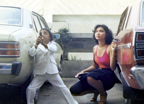 The one challenge with an action movie starring a midget is that you’re going to struggle to find a stunt double, so luckily Weng Weng is more than capable of performing his own stunts. It does look like he gets a helping hand at times however – some scenes see him sliding backwards across the floor at speed while firing a gun, a trick no doubt performed by having an off-camera crew member physically launch him across the floor. There’s also one hilarious scene where he leaps on a criminal from the top of a stairwell, clearly achieved by having someone literally chuck him at them.
