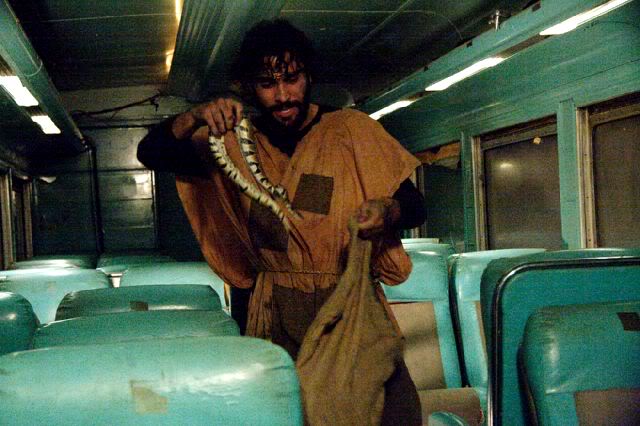 I’m going to attempt to relay the plot to you, but forgive me if a few things are lost along the way because it’s truly a bizarre story. Some guy and his girlfriend sneak their way onto a train and hide out in the cargo hold. His girlfriend is extremely ill, because a curse has been put on her, a curse that somehow led to a load of snakes hatching inside her stomach.
