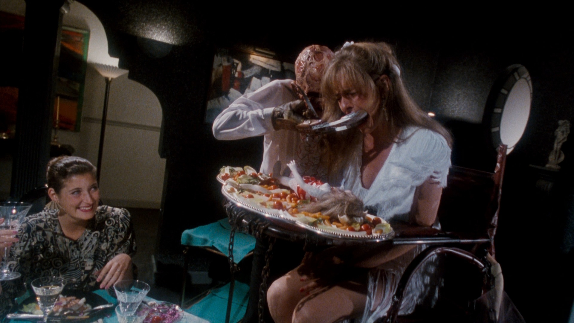 Cue Greta having her fear of eating used against her, as she’s force-fed until she dies. Yum! Meanwhile, Mark is sucked into a comic book world where he’s made of paper, and is shredded by a superhero version of Freddy.